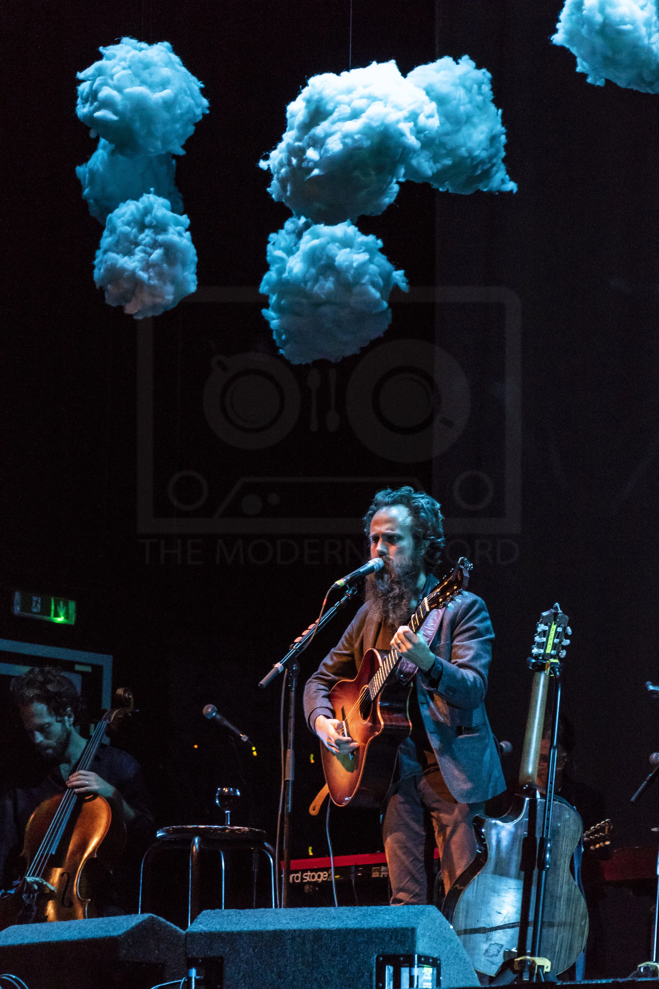 Beneath the clouds appears Iron and Wine, a five-piece ensemble vehicle for the music of singer-songwriter Sam Beam. It's been a few years since Beam performed under this name in Scotland but he's welcomed almost like family by his adoring audience. Despite almost stumbling into position he appears relaxed and comfortable as he starts into mellow opener 'The Trapeze Swinger'. Performing with him are Beth Goodfellow and Eliza Hardy-Jones on percussion and keys respectively, Sebastian Steinberg on electric and double bass, and Teddy Rankin-Parker on cello, all providing vocals throughout the show.