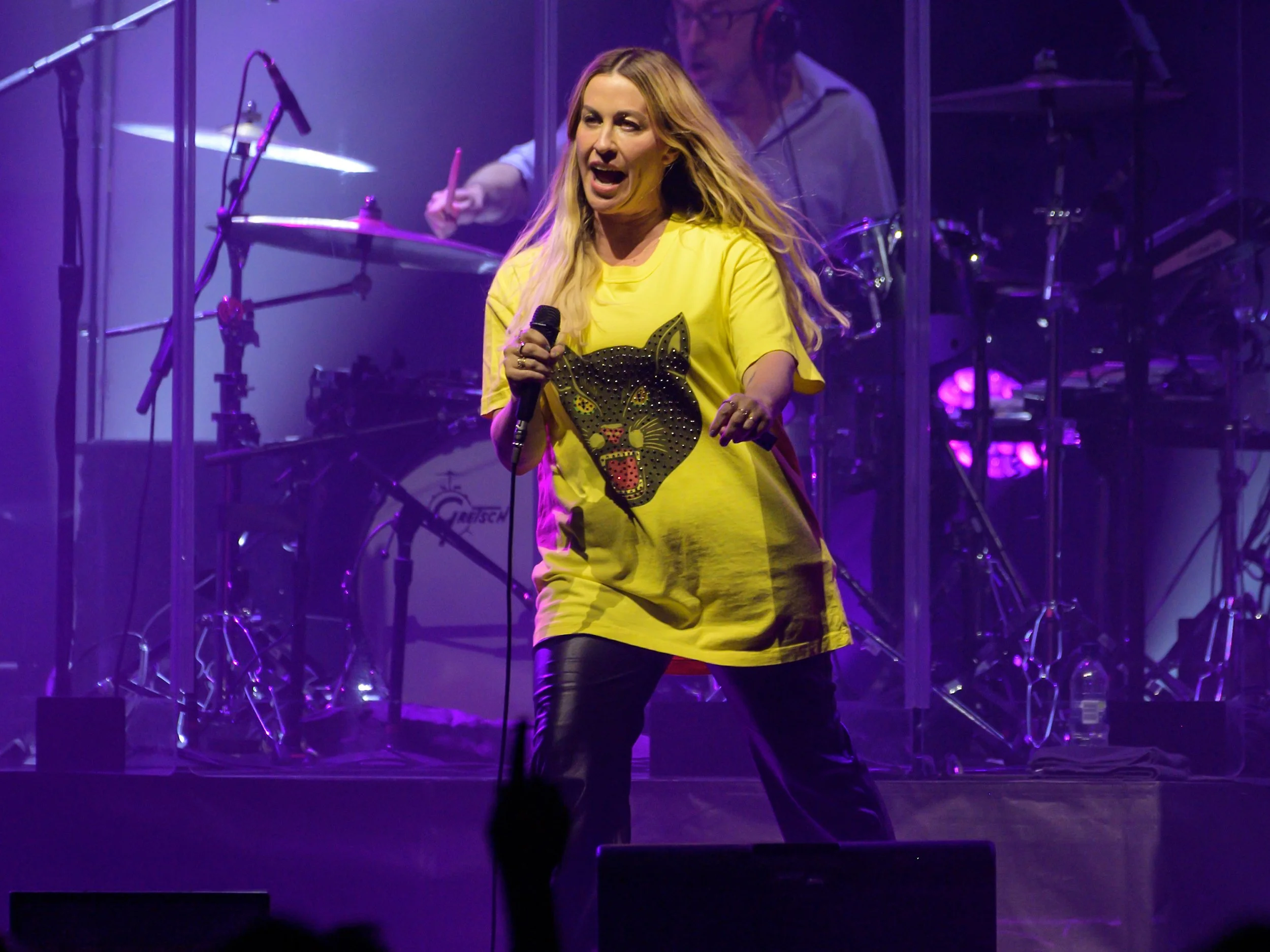 The perpetual outsider, Morissette has never been an artist truly comfortable being as famous as she is. However, she knows her power. She started the night with a display of her influence – and, my word, she is influential. Clips of just a small amount of the many uses of her work were played. Looking incredible, Morissette wore a bright yellow baggy T-shirt with a big cat face on the front and leather trousers as she patrolled her stage with a punchy energy that oozed both purpose and relaxation.