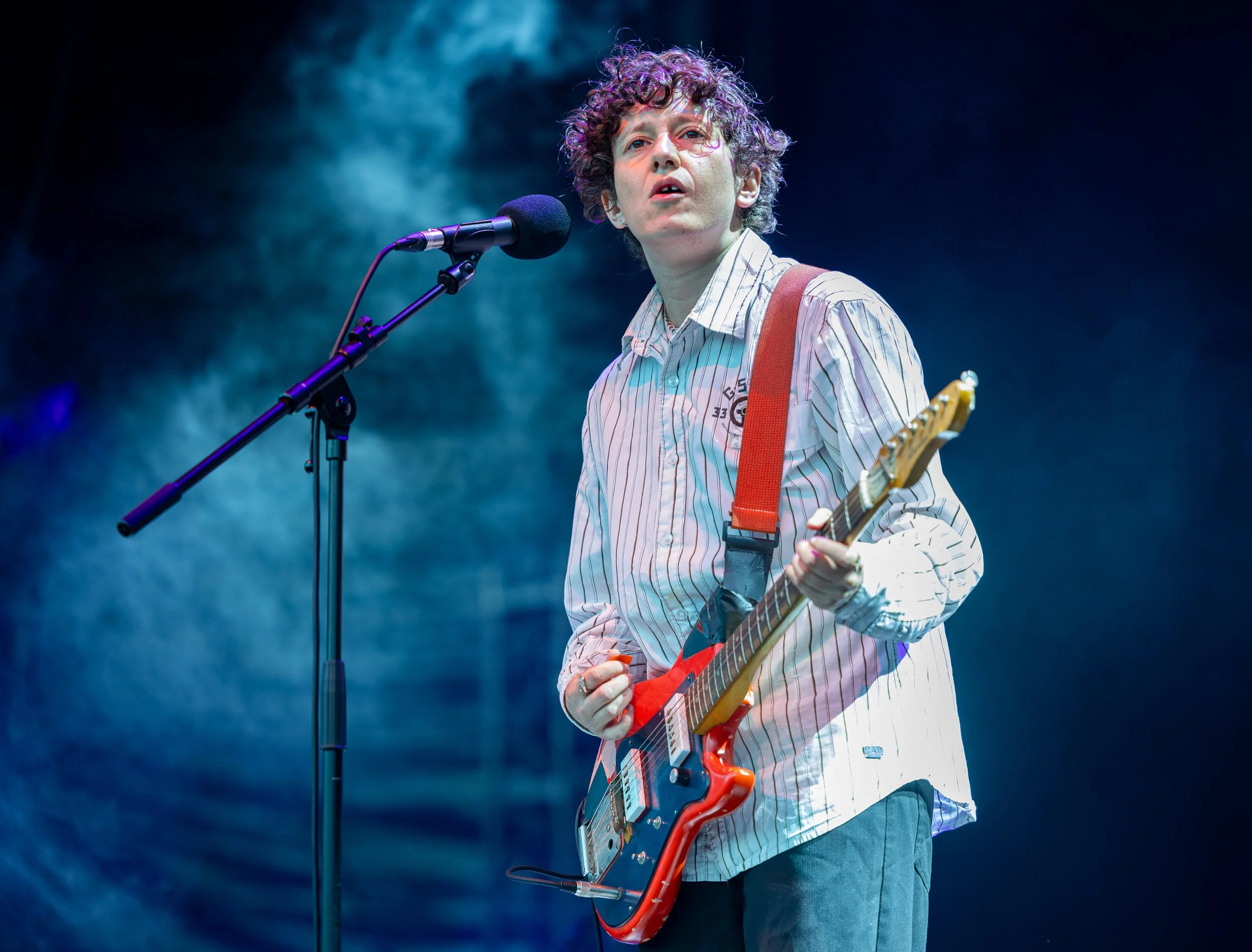 This was my first visit to the iconic Piece Hall in Halifax and what a remarkable place it is. The stage is within easy view of most places and the sound seems to be pitch perfect wherever you are. I hadn’t seen PJ Harvey play live for quite a few years, so I was looking forward to it. But first up it was time for the support act Mica Levi, someone that I was not familiar with and without a doubt this is the worst support act that I have ever experienced. His overuse of effects and echo was for me, and many other people I spoke to, self-indulgent and very Avant Garde (as in the John Lennon definition*). Vocally it was like a tuneless drone in the main. I was captivated by the lady doing the signing for the deaf people in the audience, she was a real trouper. The most positive thing Mica did was shout Free Palestine before the last number. As a follow up I have listened to some of Mica’s soundtrack music on Spotify this morning and frankly it is brilliant. So, I am not sure what that musical mess was on the Piece Hall stage.